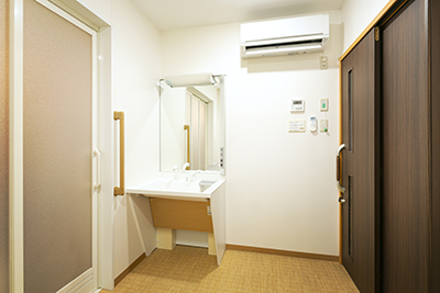 車椅子も入れる広さと、緊急ボタンや物入れ棚も配備。安心してお使いいただけます。